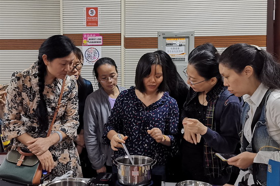 講課結束后,進入膏方現場熬制和體驗環節。本次膏方體驗活動的主角二冬膏,是一種傳統膏方,出自明朝洪基《攝生秘剖》,具有養陰潤肺的功效,特別適合秋冬干燥季節服用。二冬膏中僅僅使用了麥冬、天冬兩味中藥,均有清熱滋陰、生津潤燥、潤肺止咳之功,兩藥合用,其功益彰,彰顯中醫配伍理念的獨特魅力。潘高壽的工作人員現場示范如何熬制二冬膏,學員們認真觀看熬制的全過程,積極地問詢,并主動嘗試熬制、試味、分裝。現場到處是學員們體驗非物質文化遺產的喜悅笑容,到處聽到他們對非物質文化遺產喜愛的聲音。