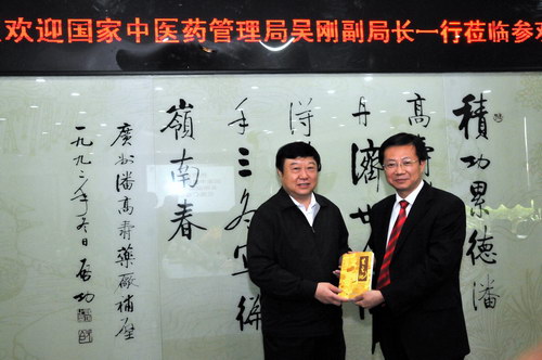 魏大華董事長向中醫(yī)藥管理局副局長吳剛贈書