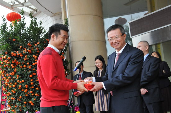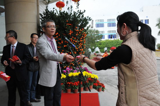 新年伊始,萬象更新。2月7日,農歷正月初八,廣州白云山潘高壽藥業股份有限公司2014年開工儀式于公司綜合樓前廣場舉行。儀式由潘高壽總經理楊東升主持,廣藥集團紀委書記冼家雄、人力資源部(組織部)部長李錦云、副部長霍志成、紀監室副主任李仕平、風控辦副主任張小文、保衛部副部長陳基金前來賀歲慰問,共賀開工大吉。
